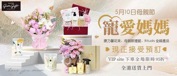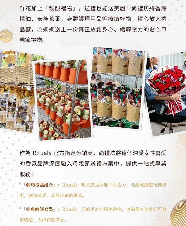 💐 母親節寵愛媽咪!尚禮坊母親節花禮現正接受預訂,VIP site 下單全場限時95折:Rituals 明星產品、康乃馨花束、企業專屬定制優惠,全港直送!